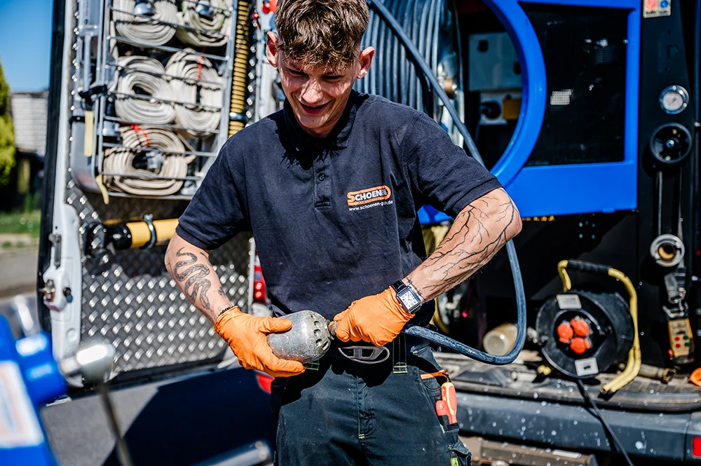Bei der Hochdruck Rohrreinigung kommen professionelle Spülsysteme mit leistungsstarker Hochdruckpumpe zum Einsatz. Das Wasser wird mit einem Druck von bis zu 150 bar durch speziell entwickelte Düsen in das Rohrsystem geleitet. So lassen sich selbst hartnäckige Rückstände wie mineralische Ablagerungen, Fette oder organische Stoffe gründlich und ohne chemische Zusätze lösen. Auch die Umwelt haben wir somit bei unserer Arbeit immer mit im Blick. Je nach Art und Umfang der Verschmutzung setzen wir verschiedene Werkzeuge wie rotierende Düsen, Kettenschleudern oder Fräsaufsätze ein. Dadurch stehen uns flexible technische Möglichkeiten zur Verfügung, mit denen wir für jede Leitung die passende Lösung parat haben.